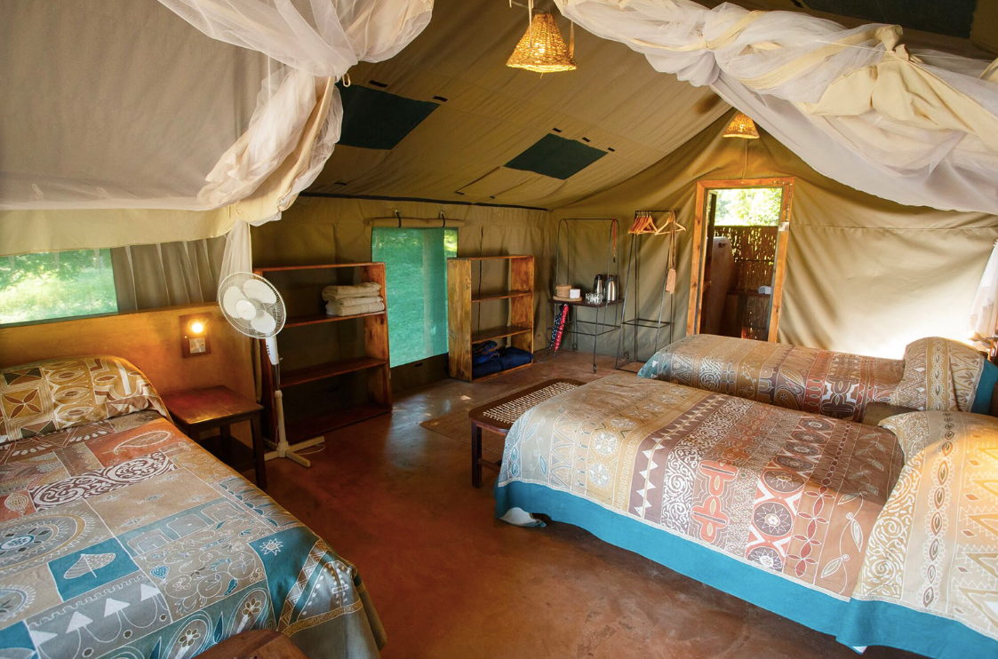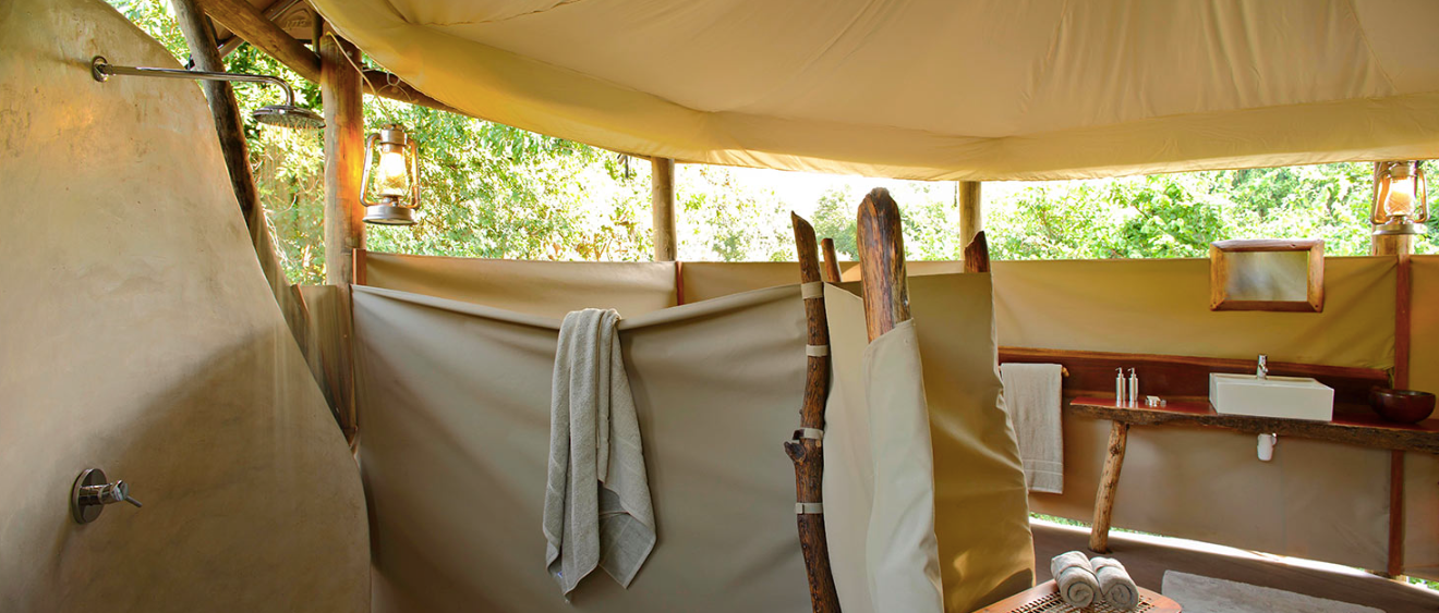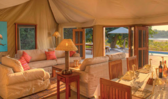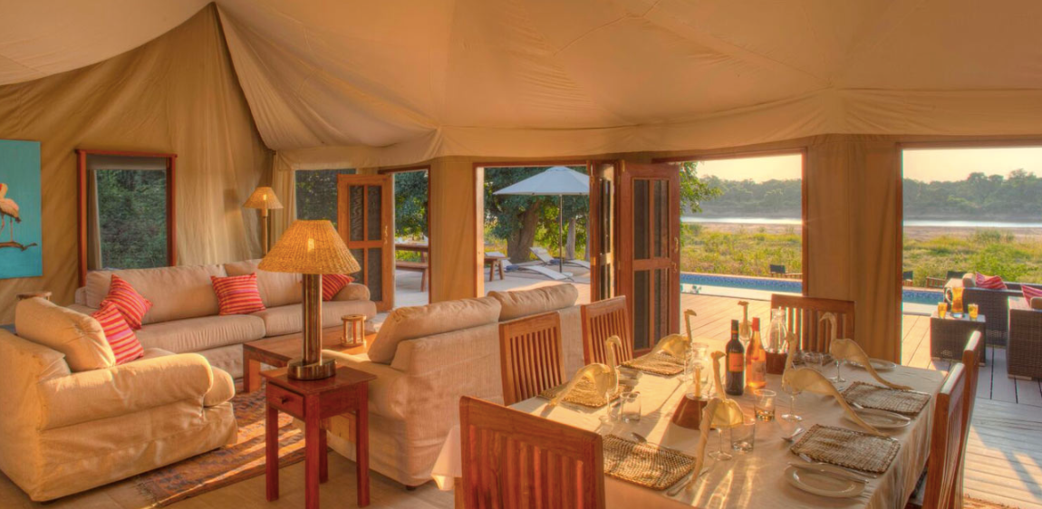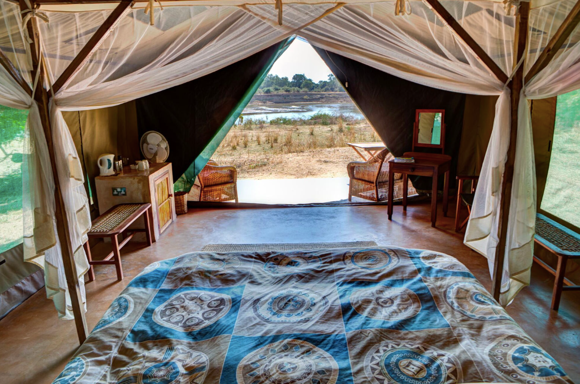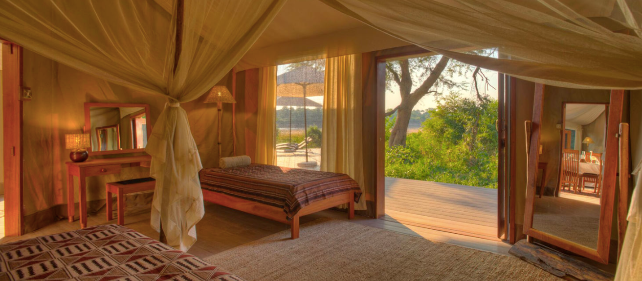 The luxury en-suite safari tents offer a romantic and immersive African experience on the banks of the Luangwa River, with soft bedding, open-air bathrooms, and stunning views of the wildlife.