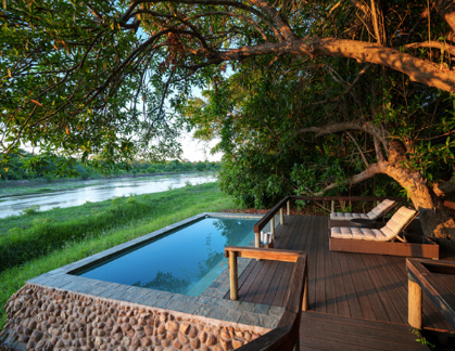 The camp’s facilities include a spacious main lounge and dining area that opens onto a tiered deck with picturesque views of the Kapamba River. Guests can also relax by the swimming pool overlooking the river or enjoy refreshments at the fully stocked bar. Kapamba operates on solar power with limited charging facilities available and lighting provided by solar light and paraffin lamps. A complimentary limited laundry service is offered to guests.